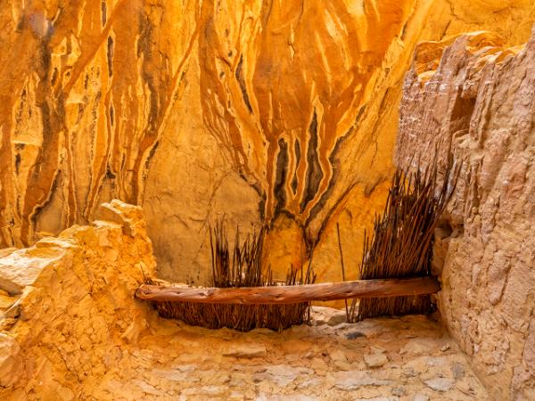 Looking up at a partial roof and water stained ceiling of the well-preserved Monarch Cave Cliff Dwelling on Comb Ridge in Bears Ears National Monument is Southeast Utah.