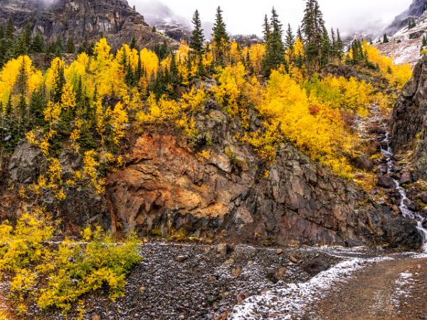 Golden Aspen trees and a small waterfall on a rock cliff above Crown Mine Road in the Chattanooga Valley off the Million Dollar Highway just North of Silverton, Colorado.